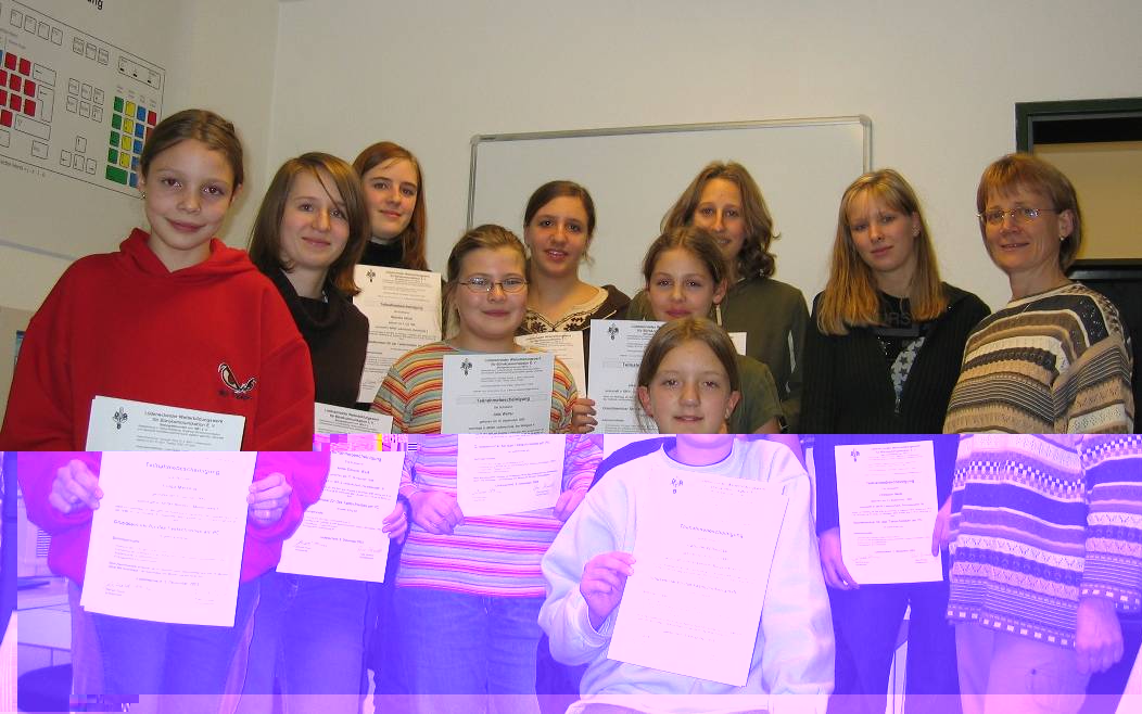 Am Dienstag, 20. Mai 2003, und an weiteren 19 Dienstagnachmittagen, jeweils von 17:30 bis 19:00 Uhr, wurden 11 Schülerinnen der Geburtsjahrgänge 1986 bis 1993 in das rationelle Handling einer PC-Tastatur eingeführt. Sie erlernten das 10-Finger-Tastschreiben am Personal Computer und erarbeiteten systematisch die Griffwege auf der alphanumerischen Tastatur (Buchstaben, Ziffern, Sonderzeichen, Zusatzfunktionen). Nebenbei erreichten sie durch regelmäßiges Üben auch eine praxisgerechte Schreibfertigkeit. Die Seminarleiterin, Frau Petra Schmidt, und Vorsitzender Gerhard Skups freuen sich, diesen Kurs heute erfolgreich abschließen zu können und somit auch für die Kids eine zeitgemäße Variante jugendpflegerischer Betätigung verwirklicht zu haben. Diese wichtige Arbeit soll fortgesetzt werden.