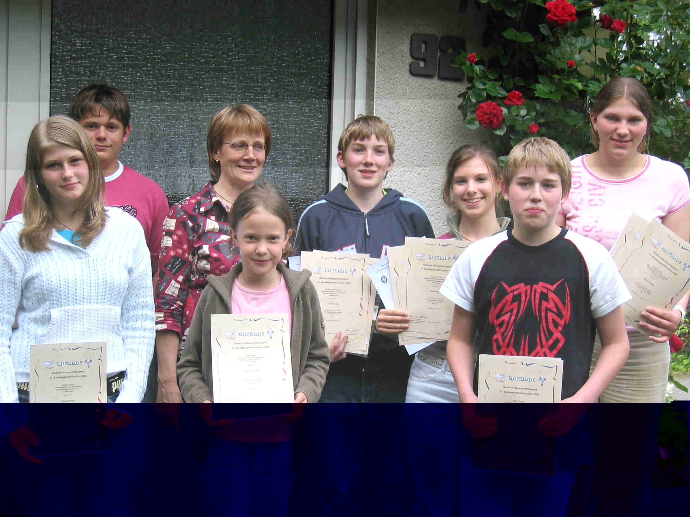 Für den letzten Übungsnachmittag vor den Sommerferien hatte Übungsleiterin Petra Schmidt ihre “Kids” aus einem besonderen Anlass zusammengetrommelt: die Urkunden von Bezirkstag und Bundesjugendschreiben 2006 wurden überreicht. Auf dem Foto zu sehen sind Petra Schmidt (hinten, 2. v. l.), Janine Haake und Nina Funke - die als Kursteilnehmer am BJS teilgenommen hatten - sowie Sarah Veldhoen, Kathrin Urbas, Oliver Jaap, Norman und Marvin Baumgärtner aus der Übungsgruppe. Nicht im Bild, obwohl sie ebenfalls sehr gut bei den BJS abgeschnitten hat, ist Sulamith Willfort, die auch gerade erst das Tastschreiben erlernt hatte.